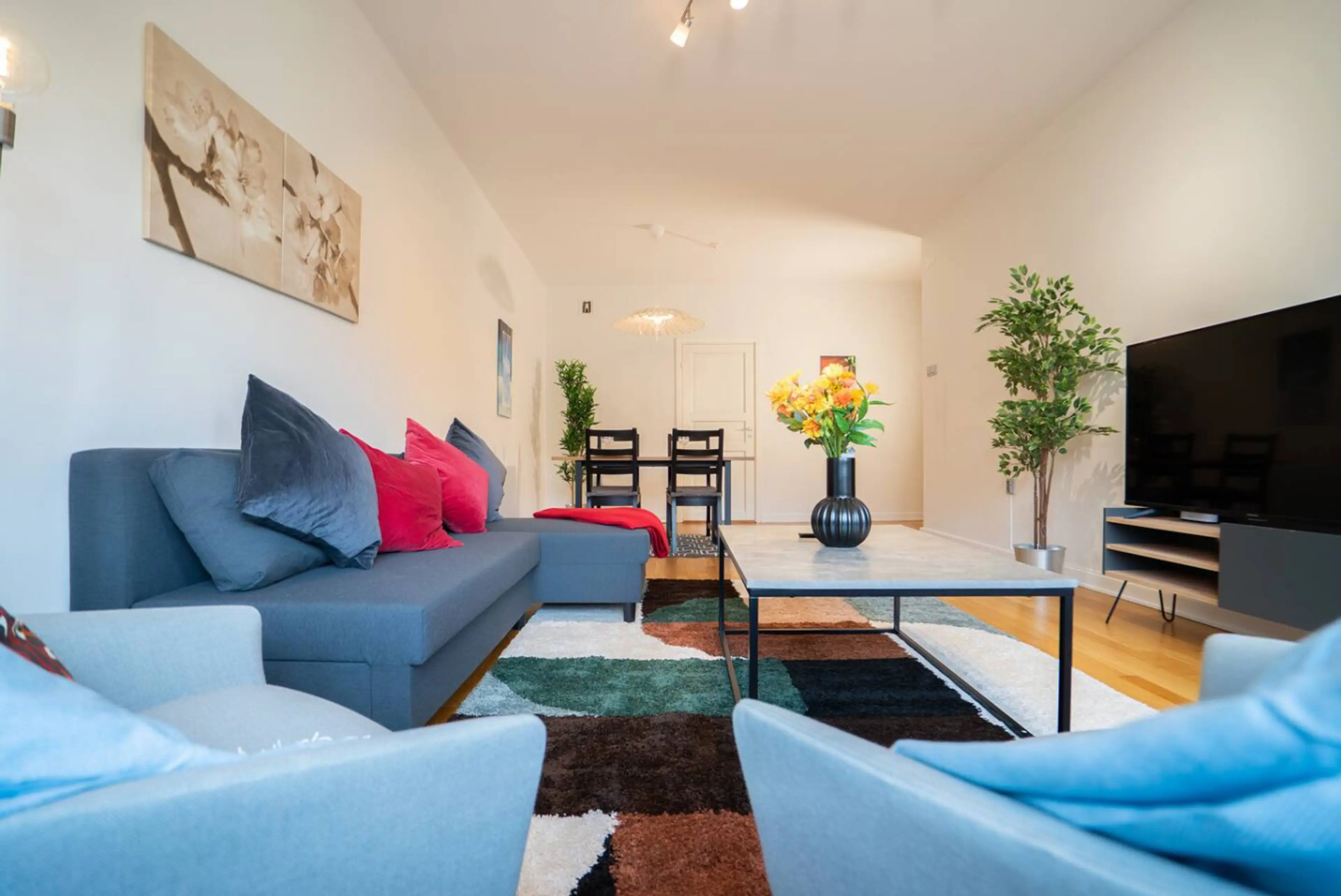 Positive: Lägenheten är stor och rymlig samt sparsamt inredd vilket passsar vår familj på 5 personer perfekt. Matbordet i vardagsrummet var en bra lösning eftersom det i köket är ganska trångt fastän det även där finns ett matbord. Ventilationen fungerar förvånansvärt bra fastän byggnaden och lägenheten verkar vara ganska gammal. Netflix på TV:n var omtyckt av barnen :)